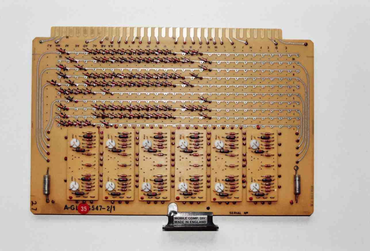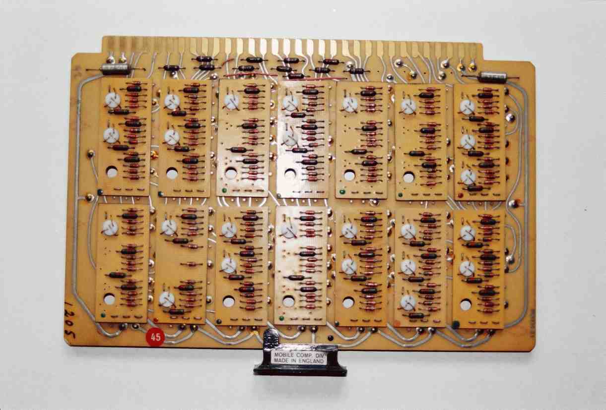 My own Elliott computer is an "Arch 9000", which is really a 920B or a 903, but in a different box, and with a re-arranged control panel. This photograph shows most of the computer. (The processor and 8192-word store are in the centre rack, the extra 8192-word store is to the left, and the paper-tape logic and power supplies are to the right). Here are close-ups of that control panel, and of an A-GL card (initial instructions) and an A-FA card (one of 18 identical cards each holding a bit of each register).